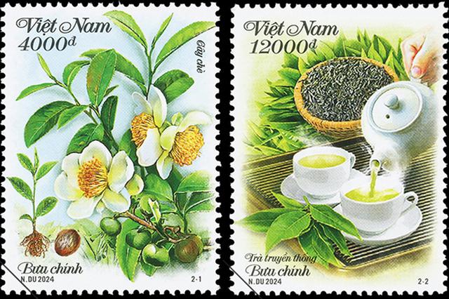 Hai mẫu tem của bộ "Cây chè" miêu tả quá trình sinh trưởng của cây chè và cho ra sản phẩm trà. Ảnh: VNP