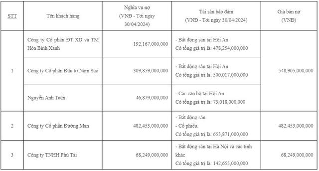 Cụ thể, khoản nợ của CTCP Đầu tư Xây dựng và Thương mại Hoà Bình Xanh tính tới 30/4/2024 là 192,167 tỷ đồng. Tài sản đảm bảo là bất động sản tại Hội An trị giá 478,254 tỷ đồng.