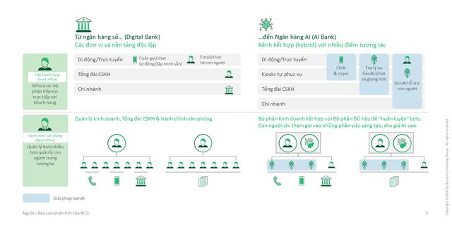 Các tổ chức tài chính cũng có xu hướng tái cấu trúc, chỉ định các đơn vị kinh doanh đóng vai trò "Quản lý sản phẩm/Product Owner", đồng thời sở hữu chuỗi vận hành toàn diện nhằm củng cố cơ sở hạ tầng, dịch vụ dữ liệu,... Quy trình hoạt động được chuyển đổi, tinh chỉnh để trở nên đơn giản thông qua ứng dụng GenAI. Công nghệ này đang tạo nên cuộc cách mạng trong ngành với khả năng quản lý các tương tác với khách hàng và tự động hóa quy trình hành chính (như xử lý yêu cầu, đánh giá tín dụng, quảng cáo, kiểm tra tuân thủ và đánh giá nhân sự).