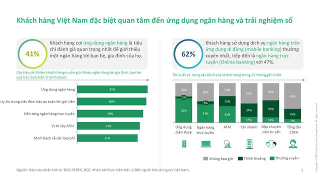 Theo Nghiên cứu Tiêu chuẩn đánh giá Hiệu suất Ngân hàng Bán lẻ (REBEX) được Tập đoàn tư vấn Boston Consulting Group (BCG) tiến hành vào năm 2023 tại Việt Nam, 41% khách hàng cho biết hiệu suất ứng dụng ngân hàng (mobile banking app) là tiêu chí đánh giá quan trọng nhất để giới thiệu một ngân hàng cho gia đình hoặc bạn bè. Ngoài ra, 62% khách hàng thường xuyên sử dụng ứng dụng ngân hàng trên thiết bị di động (mobile banking) – kênh được ưa chuộng hàng đầu. Đứng thứ hai là ngân hàng trực tuyến (internet banking) với tỷ lệ 47%.